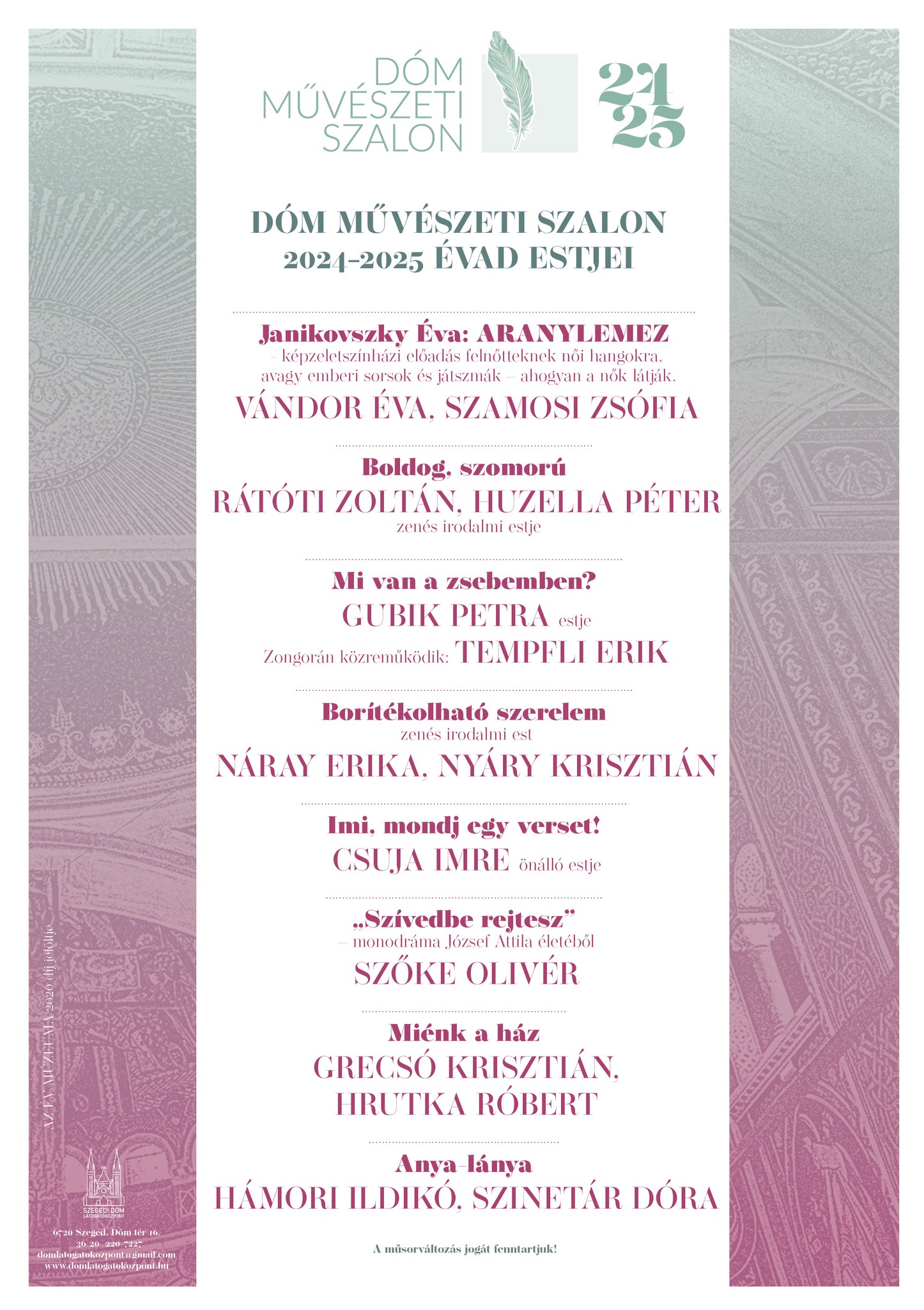 Nagy örömmel értesítjük Önöket, hogy a bérletek értékesítése a Dóm Művészeti Szalon szeptemberben induló 2024/25-ös évadára, az ÚJ érdeklődők számára is megkezdődött.